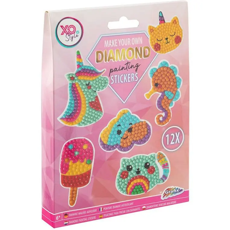 Комплектация: алмазная ручка, разноцветные стразы (9 цветов), 12 наклеек, специальный пластиковый контейнер для работы со стразами, клей.