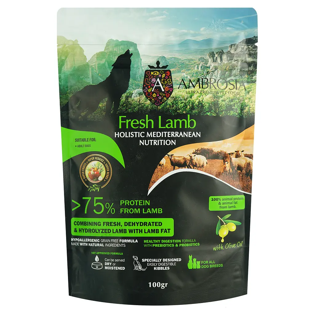 Корм AMBROSIA — это беззерновой гипоаллергенный корм для собак, созданный по принципам средиземноморской диеты. В его основе — мясо ягненка, обеспечивающее легкоусвояемый белок. Оливковое масло, средиземноморские фрукты и ароматные травы обогащают рацион антиоксидантами и полезными жирами. AMBROSIA создана как пища для богов — с заботой, качеством и вкусом.