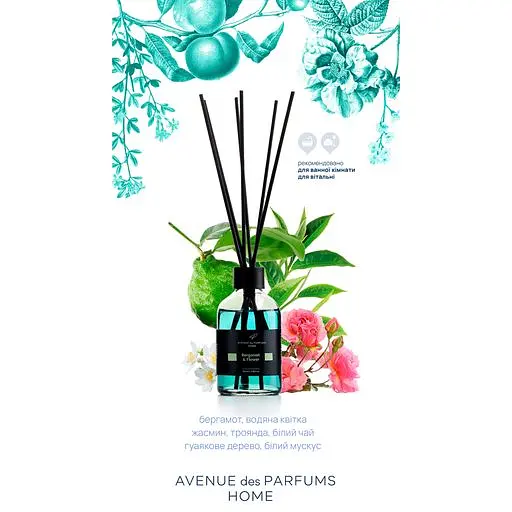 Аромадифузор Avenue des Parfums Bergamot & Flower 100 мл – это легкий акватично – цветочный аромат, который будет приветливо и непринужденно встречать тебя или твоих гостей в доме и медленно расслаблять после активного дня.