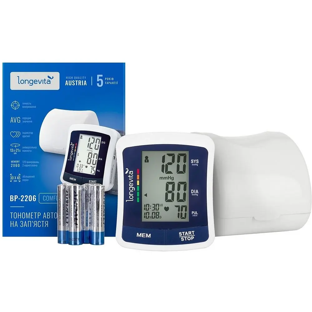 Автоматический тонометр Longevita ВР-2206 позволяет легко надеть аппарат на руку и с помощью специальной манжеты зафиксировать его, получив показатели систолического и диастолического давления, а также данные пульса.