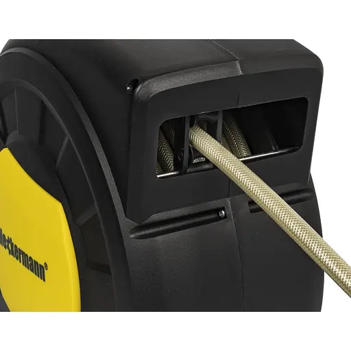 Автоматическую катушку для садового шланга можно легко закрепить на стене, поскольку она оснащена специальным настенным кронштейном. В комплект входят необходимые аксессуары для сборки. Ручка позволяет устройству поворачиваться на 180°, что позволяет легко перемещать садовый шланг. Перемотка шланга на барабан происходит автоматически и плавно.
