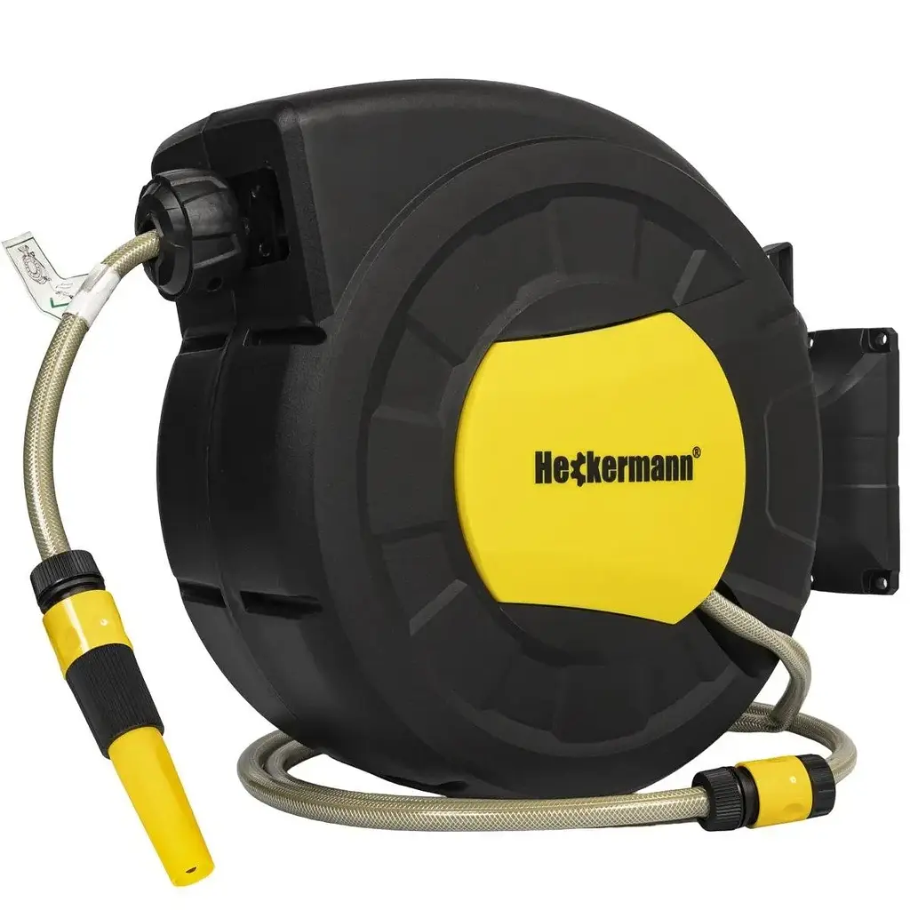 Автоматическую катушку для садового шланга можно легко закрепить на стене, поскольку она оснащена специальным настенным кронштейном. В комплект входят необходимые аксессуары для сборки. Ручка позволяет устройству возвращаться на 180° что позволяет легко перемещать садовый шланг. Перемотка шланга на барабан производится автоматически и плавно.