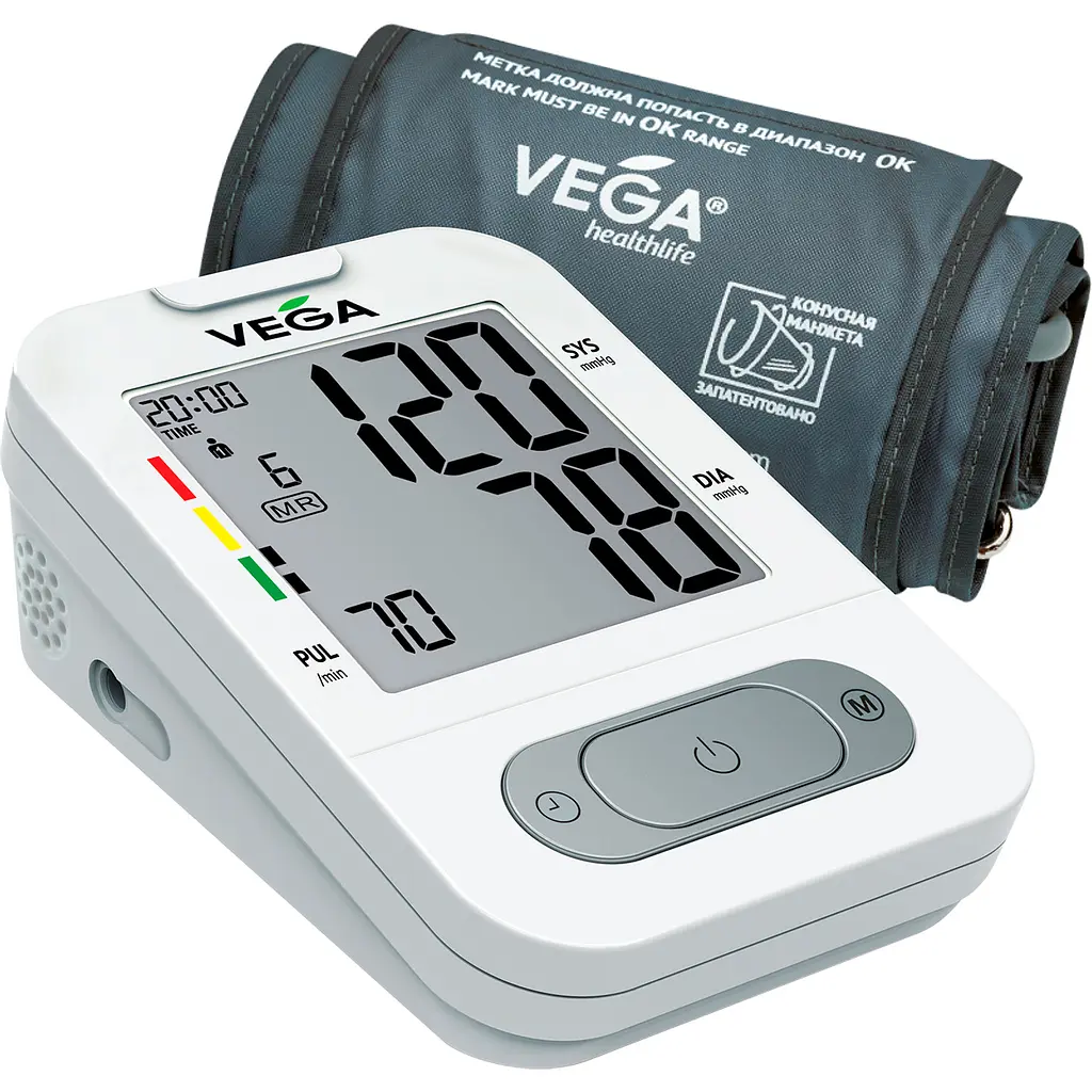 Для комфортного использования и легкого чтения результатов измерения тонометр обладает большим жидкокристаллическим дисплеем, на котором отображаются крупные цифры систолического и диастолического (верхнего и нижнего) давления и частота пульса. Тонометр Vega VA-350 не требует дополнительных настроек - измерение происходит нажатием одной кнопки.