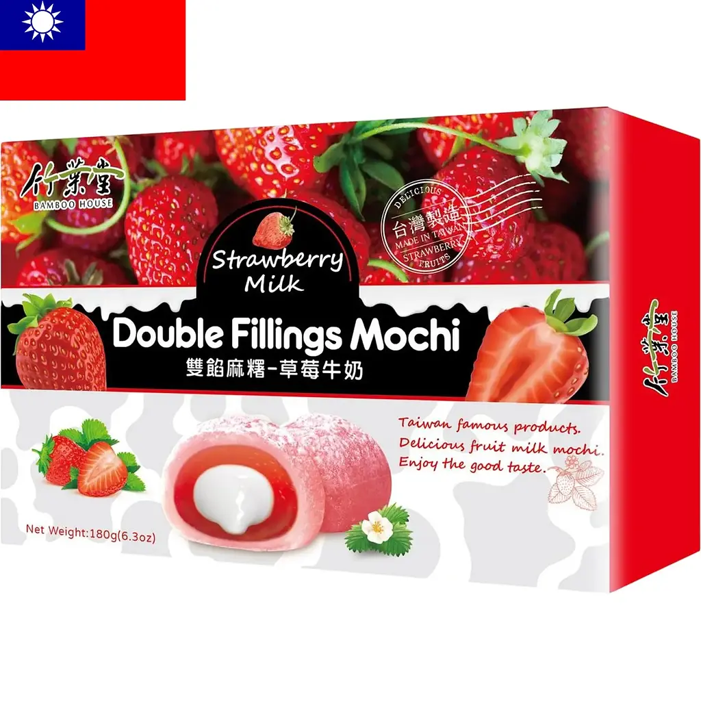 Мальтоза, клубничная паста (клубника, мальтоза, сахар, пальмовое масло), клейкий рис порошок, пшено, сахар, пальмовое масло, молочная паста (мальтоза, яичный белок, сахар, пальмовое масло, молоко порошок). Гидроксипропилен-крахмала фосфат (e1442), сорбит (е420), пищевые красители: красный #40(e129)), ароматизатор, сорбат калия (консервант, e202).