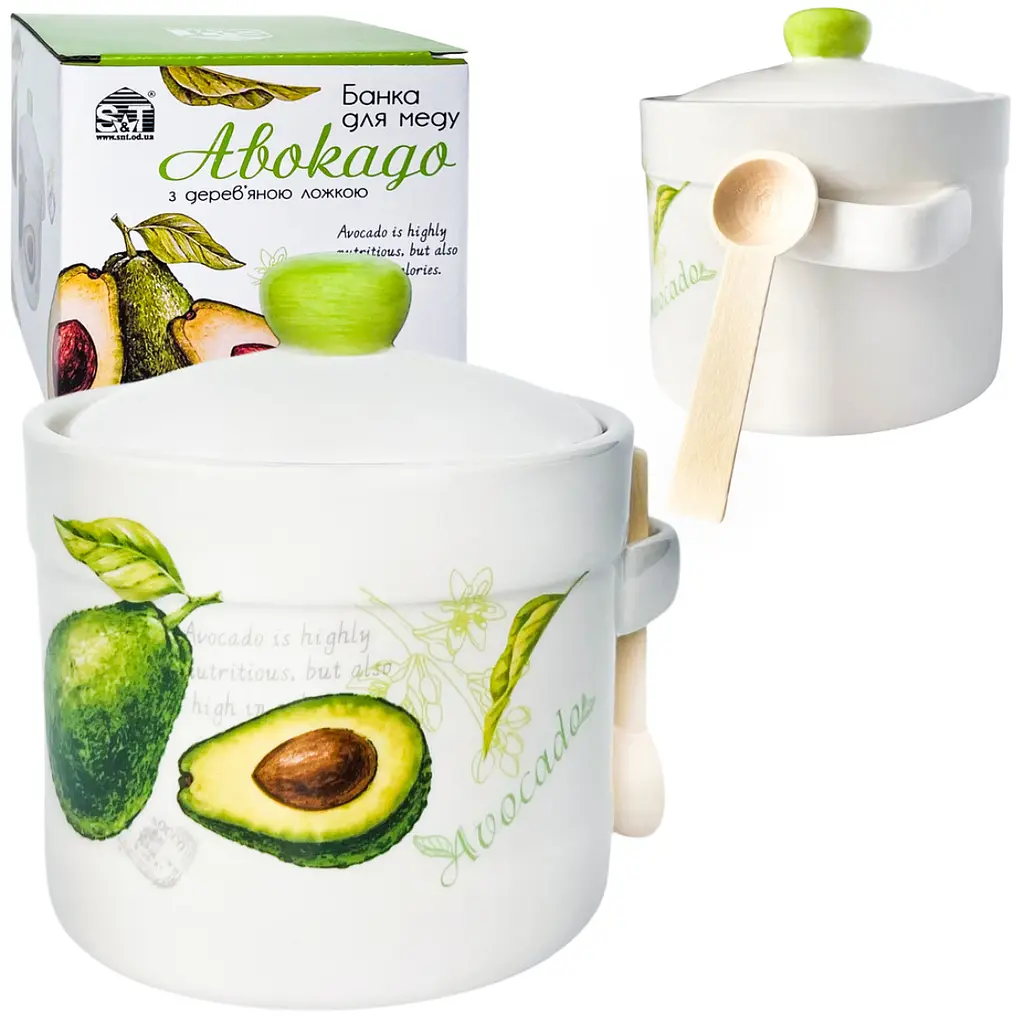 Банка для меда S&T Авокадо с деревянной ложкой непременно украсит интерьер вашей кухни.