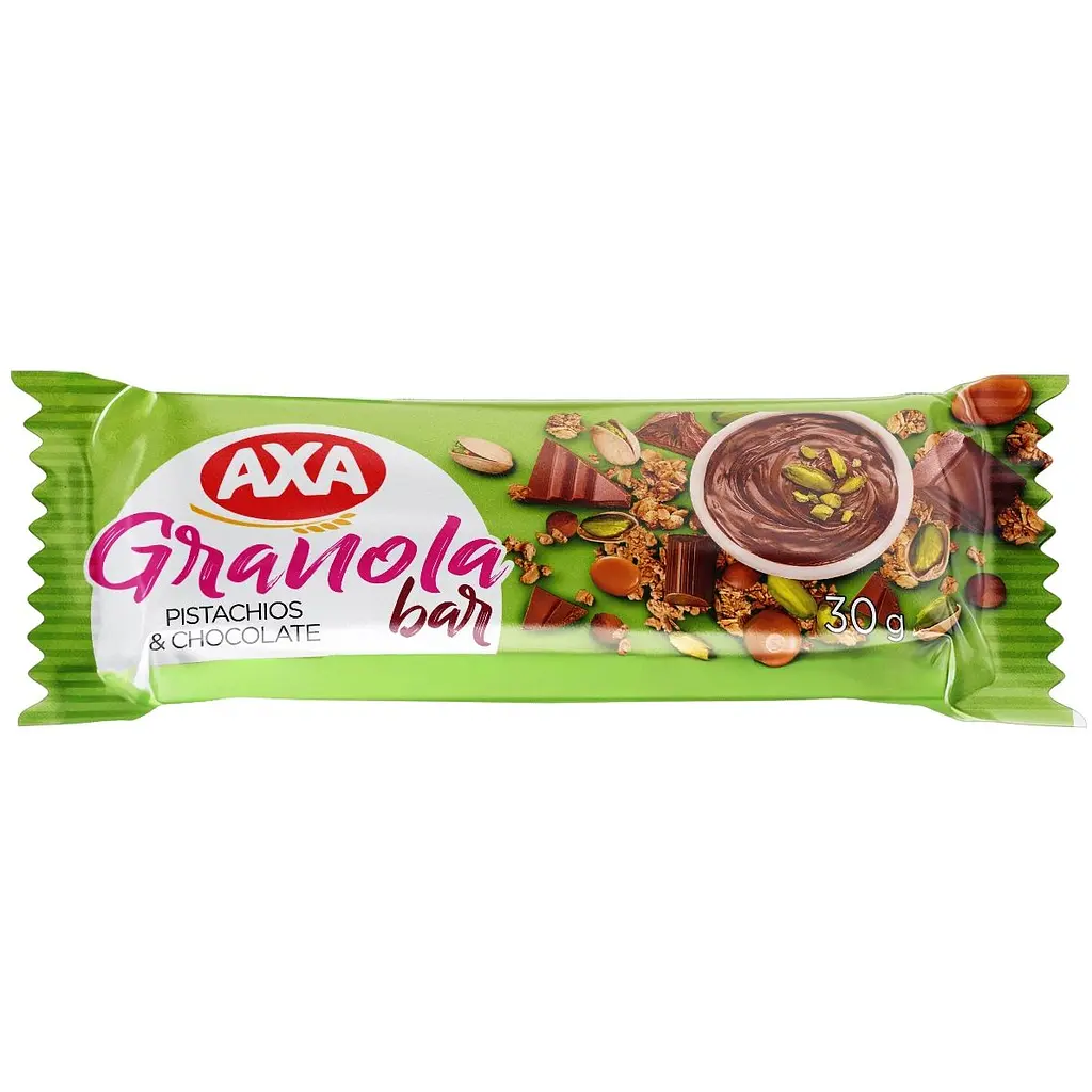 Батончики гранолы AXA - это небольшие зерновые батончики, изготовленные на основе гранолы (смеси круп и хлопьев), фруктов, орехов и вкусовых компонентов. Они выпускаются в индивидуальных порциях по 30 г.