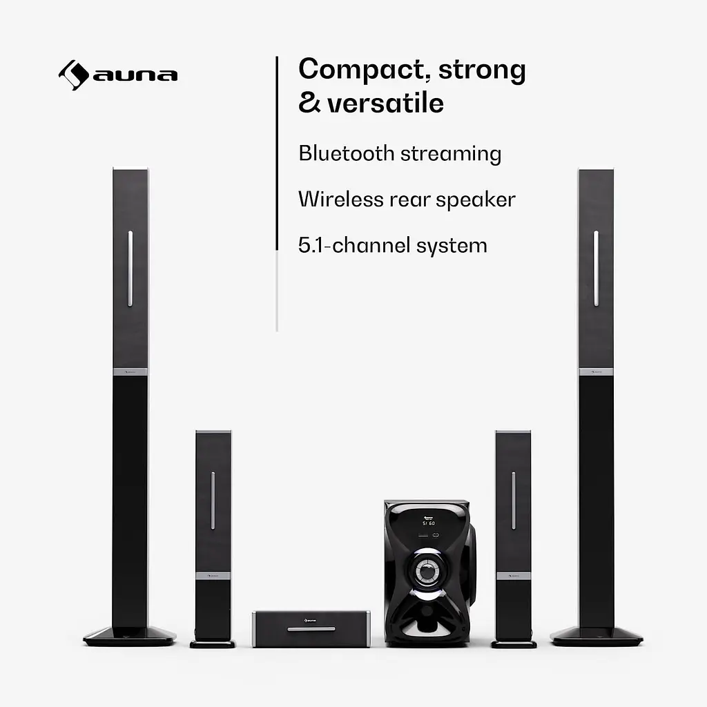 Система Areal 5.1 извлекает звук из различных источников благодаря многочисленным соединениям: система объемного звучания взаимодействует с портативными носителями данных, такими как USB и SD-карты, через переднюю панель, обеспечивая легкий доступ к MP3-трекам. Функция Bluetooth также обеспечивает беспроводную потоковую передачу через смартфон, планшет или ноутбук. Это означает, что ваши любимые хиты всегда готовы к прослушиванию. Все виды аудиокомпонентов, такие как компьютеры, CD- и MP3-плееры, также могут быть подключены к беспроводной аудиосистеме Areal 5.1 через вход AUX на задней панели.