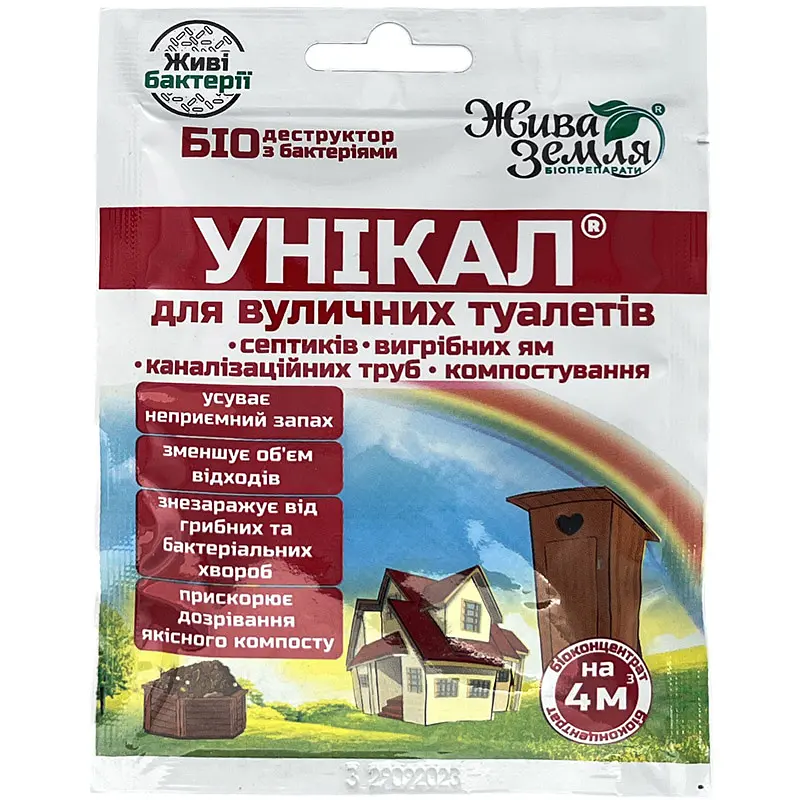 Биодеструктор Живая Земля Уникал для выгребных ям, туалетов, утилизации биологических отходов (до 4 м3 отходов). Этот препарат решает проблему утилизации органических отходов. Он эффективно перерабатывает в компост фекалии, пищевые и растительные отходы. Этому способствует содержание специальных микроорганизмов. Этот концентрат используется для обработки выгребных ям, септиков, канализационных труб.