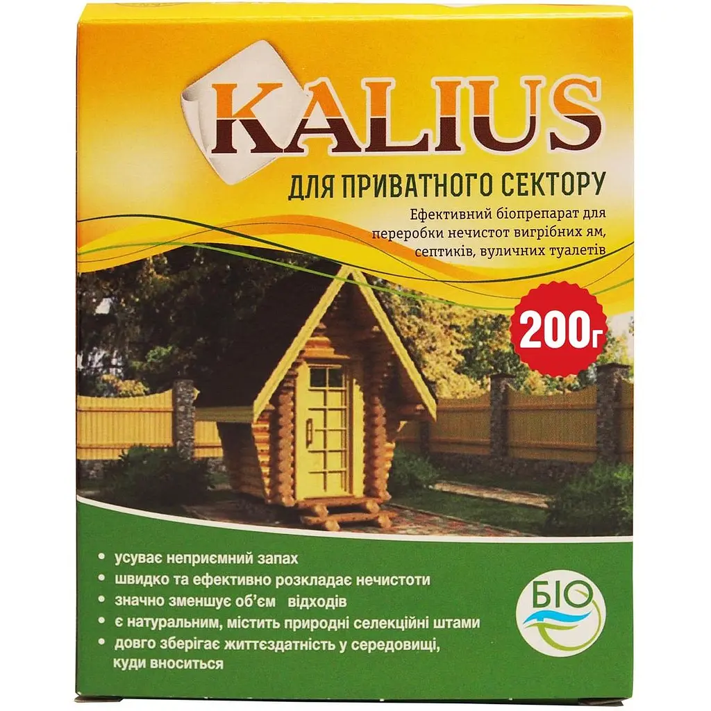 Kalius - комплекс эффективных микроорганизмов и ферментов, которые ускоряют естественную нейтрализацию загрязнений в сточных водах и канализационных системах. При попадании в выгребную яму, туалет или септик биопрепарат Kalius перерабатывает нечистоты в воду, углекислый газ и легкий осадок, является удобрением, обогащенным органическим азотом.