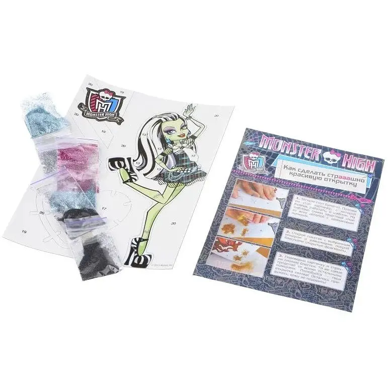 Набор для творчества Monster High позволяет вашему ребенку сделать креативную открытку с ярким рисунком. Перед исполнением нужно застелить стол бумагой, положить на стол картинку и шаблон. На шаблоне необходимо снять защитный слой со всех деталей с одинаковым номером. Затем открытые фрагменты покрываются разноцветными блестками. Лишние блестки потом нужно стряхнуть с картинки. Создание столь оригинальной открытки раскрывает творческие способности ребенка. В набор входят картинка-основа, набор блесток, подробная инструкция. Рекомендуется использовать детям старше 5 лет.
