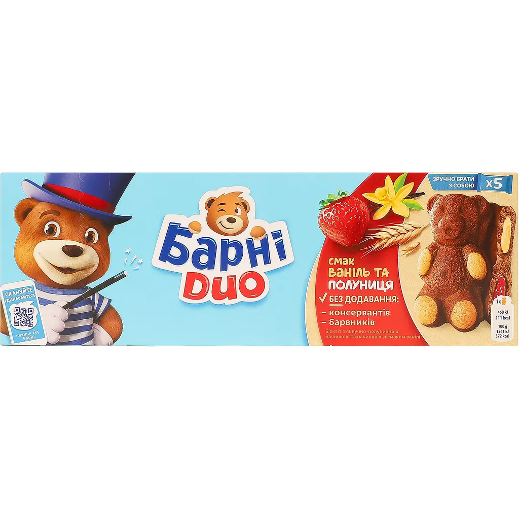 Взяли спробувати цей варіант «Дуо», бо звичайні вже трохи приїлися. Поєднання полуниці з ваніллю виявилося вдалим — смак цікавіший і такий, знаєте, по-справжньому десертний. Начинки всередині два види, вони непогано доповнюють одна одну: кислинка полуниці трохи збиває солодкість ванілі. Бісквіт, як завжди у Барні, дуже ніжний. Дитині сподобалося, що ведмедик «двоколірний». Для різноманіття — саме те, що треба.