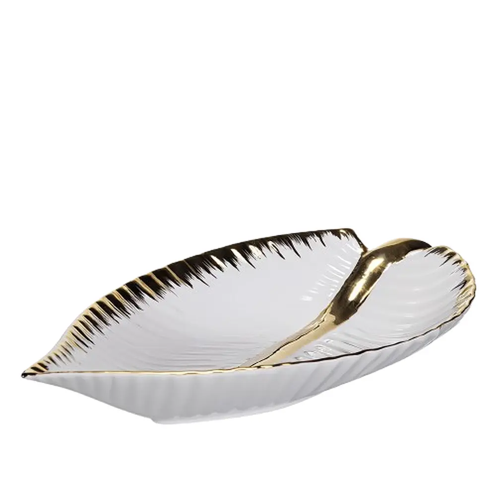 Большое декоративное блюдо Перо 40 см белое с золотом — фарфоровая тарелка в форме листа для фруктов и сервировки.
