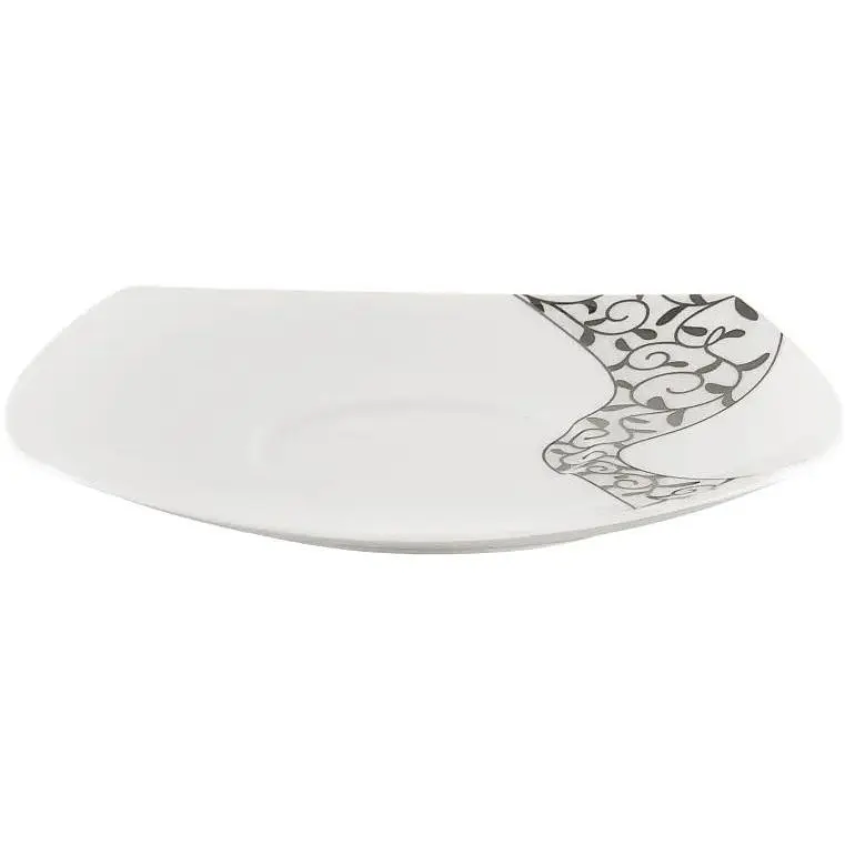 Блюдце с серебристым растительным рисунком. Диаметр - 140 мм. Чайное блюдце - традиционная посуда для чаепития. Блюдце нужно не только для того, чтобы чай из чашки не капал на скатерть. Оно может стать и миниатюрной тарелочкой для выпечки, конфет или других сладостей. Изготовлено блюдце из костяного фарфора. Впервые костяной фарфор появился еще в древнем Китае, где за особые свойства - тонкость, которая достигала прозрачности - его назвали яичной скорлупой. Китайцы берегли свой секрет, и в Европе фарфор пришлось изобретать заново. Здесь его прозвали королевским фарфором и белым золотом, и не зря, ведь изделия из костяного фарфора отличаются благородным белым цветом и особым звучанием. В чем же секрет? Он чрезвычайно прост. Костяной фарфор не зря так называется, в него добавляют костяную муку - перемолотые кости животных. Это абсолютно натуральное сырье, безопасное для здоровья человека. Именно костная мука наделяет фарфоровые изделия уникальными свойствами.
