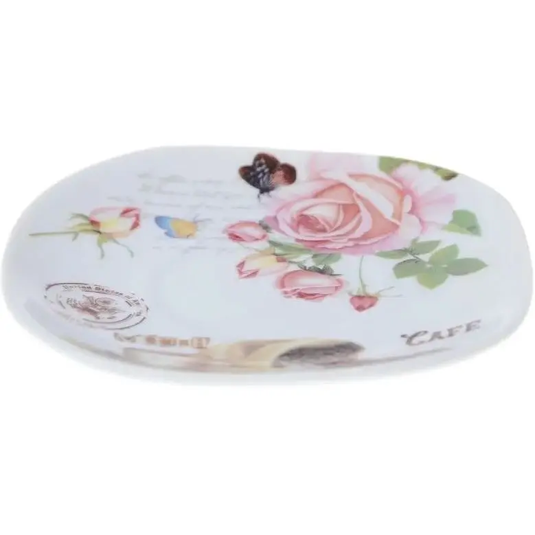 Блюдце NP86PL/90 изготовлено из фарфора - одного из самых популярных материалов для производства посуды. В качестве декора использован рисунок в пастельных тонах. На нем изображена цветущая роза, стоит кофейная чашка и рассыпается ароматный кофе. Такое блюдце создано для теплых вечеров в кругу близких людей. Его можно ставить под чашку, чтобы не испачкать скатерть случайно пролитой каплей, или использовать вместо десертной тарелки. Диаметр блюдца - 11 см.