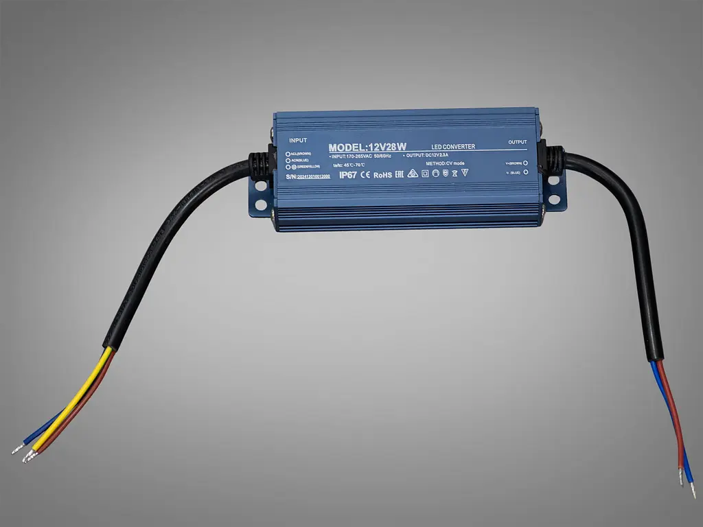 Герметичные блоки питания 12В 28Вт 2.3А для LED ленты от ТМ "Диаша". Внешне этот герметичный блок питания выглядит элегантно и надёжно: компактный алюминиевый корпус синего цвета с текстурированным покрытием подчёркивает техническую изысканность устройства. Аккуратные монтажные ушки по бокам позволяют надёжно зафиксировать блок на любой поверхности. С обеих сторон выходят толстые кабели с уже зачищенными концами, готовыми к подключению, что значительно облегчает монтаж даже в труднодоступных местах.