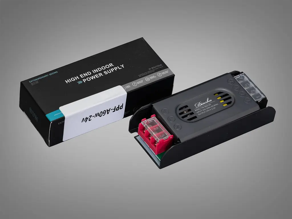 Блок питания для светодиодной ленты PPF-A60W-24V от ТМ "Diasha". Для компактных решений в подсветке и небольших проектов идеально подойдёт блок питания для лед ленты модели PPF-A60W-24V, сочетающий надёжность, безопасность и эффективность. Благодаря сбалансированным характеристикам устройство станет универсальным решением для питания различных LED систем.