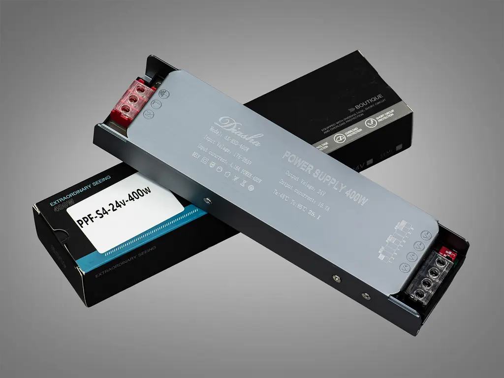Блок питания с плавным включением и регулировкой яркости PPF-S4-24V-400W от ТМ "Diasha" для светодиодной ленты. Когда речь идёт о максимальной мощности и полной надёжности, стоит выбрать блок питания для светодиодной ленты PPF-S4-24V-400W — модель, соответствующая самым высоким требованиям современных световых систем. Это решение создано для масштабных проектов, где важна стабильность, управляемость и защита компонентов.