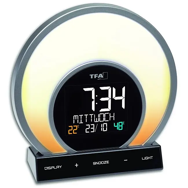 Виробник: TFA Dostmann GmbH & Co.KG, GermanyОсобливості:Світло настрою з 5 режимами (автоматична зміна кольору (CYCLE), захід сонця (ВЕЧІР), режим дихання (BREATHING), зміна кольору відповідно до рівня комфорту в приміщенні (COMFORT), ручний вибір кольору (PICK COLOR)) з вибором з 20 кольорів з 5 рівнями яскравостіНіжне пробудження з поступово освітлюючим світлом і/або мелодією будильника, що повільно збільшується. Функція повтору будильника з регульованим інтерваломКольоровий дисплей з 4 рівнями яскравості та функцією автоматичного затемненняІндикація часу, дати та дня тижня написана повними літерами (німецька, англійська, іспанська, французька)Внутрішня температура та вологістьФункція заряджання для мобільних пристроїв через USB-порт (1А)Стильний зовнішній виглядАдаптер живлення у комплектіЗареєстрований дизайн TFAБудильник SOLUNA має безліч корисних функцій. Почніть ранок із розслабленого пробудження. Поступово світло, що освітлює, м'яко виводить вас зі сну. Дисплей можна регулювати у чотирьох рівнях яскравості. Створіть приємну атмосферу у вітальні чи спальні зі світлом настрою. Ви можете вибрати один із 5 різних режимів світла настрою з вибором з 20 кольорів із 5 рівнями яскравості. Лампа затемнюється, і вона також гарна як нічний світильник. Крім того, ви можете бачити поточну дату та день тижня, написані повністю (на вибір 4 мовами) кожен день. Ви можете легко стежити за температурою та вологістю та регулювати їх за допомогою цілеспрямованого обігріву та вентиляції. Це допоможе вам створити приємне і здорове місце існування і навіть заощадити на опаленні. Особливою функцією є вбудована функція заряджання для пристроїв з USB-портом, що дозволяє заряджати смартфон протягом ночі.