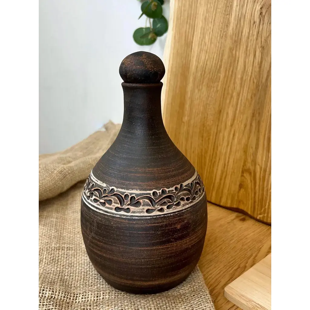 Дизайн: Округлая форма с резным орнаментом и глиняной пробкой.