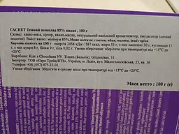 Смачний бельгійський шоколад. Без зайвих дешевих інгредієнтів. Цукру небагато та є гірчинка, які притаманні шоколаду з 85% какао. Якісний продукт. Для поціновувачів гіркого чорного шоколаду. Плитка розділена на 8 шматочків, а не на 10, як буває часто в 100-грамових шоколадках.