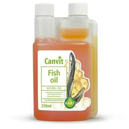 Canvit Fish Oil — Канвит Фиш Оил - жир из морского угря, содержащий высокое количество эссенциальных полиненасыщенных жирных кислот омега-3 (ДГК, ЭПК и АЛК), которые положительно влияют на качество кожи и шерсти при сухости, выпадении, тусклой шерсти и обеспечивают регенерацию сухой и поврежденной кожи. Добавка способствует общему повышению эластичности кожи и улучшает качество шерсти у собак, способствует правильному функционированию сердечно-сосудистой и нервной систем, здоровью суставов и сетчатки глаза.