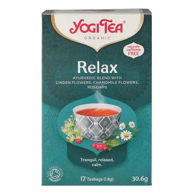 Чай травяной Yogi Tea Relax с пряностями создан на основе цветов ромашки, цветов липы, кардамона, ячменного солода, гибискуса, шиповника и разнообразных аюрведических трав.