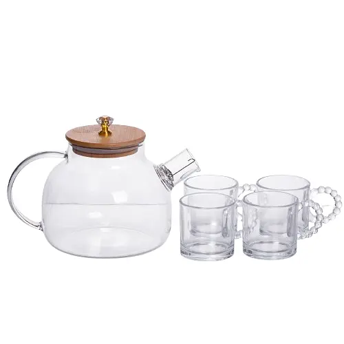 Чайник имеет диаметр 13 см и высоту 16 см, снабжен плотной бамбуковой крышкой с декоративной ручкой. Его объем – 1 литр, что позволяет приготовить напиток на несколько порций. Чашки диаметром 5.5 см и высотой 6 см имеют объем 120 мл – удобен для подачи чая, кофе или травяных настоев. Прозрачные стекла позволяют контролировать уровень напитка и создают легкий, современный вид.