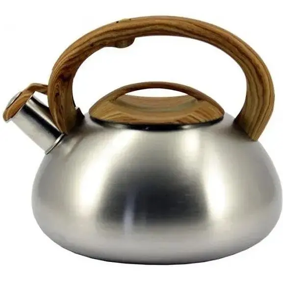 Объем чайника составляет 3 литра, идеально подходящий для большой семьи или приема гостей. Особенностью данной модели является интегрированный свисток, который оповестит вас о закипании воды, предотвращая ее выкипание. Стильная коричнева ручка из термостойкого материала обеспечивает удобный и безопасный захват, а также придает чайнику изысканный вид.
