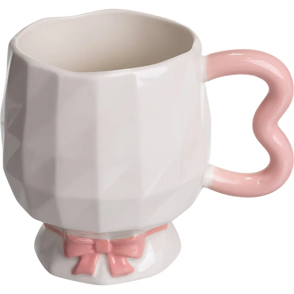 Особенностью конструкции является декоративная основа в виде рельефного банта, расположенного у ножки. Этот элемент интегрирован в корпус чашки и не выступает отдельной частью. Ручка имеет фигурную форму с плавными изгибами, что придает изделию индивидуальность и удобство в удержании. Высота чашки составляет 10 см, что делает ее пригодной для ежедневного использования или как часть тематической сервировки.