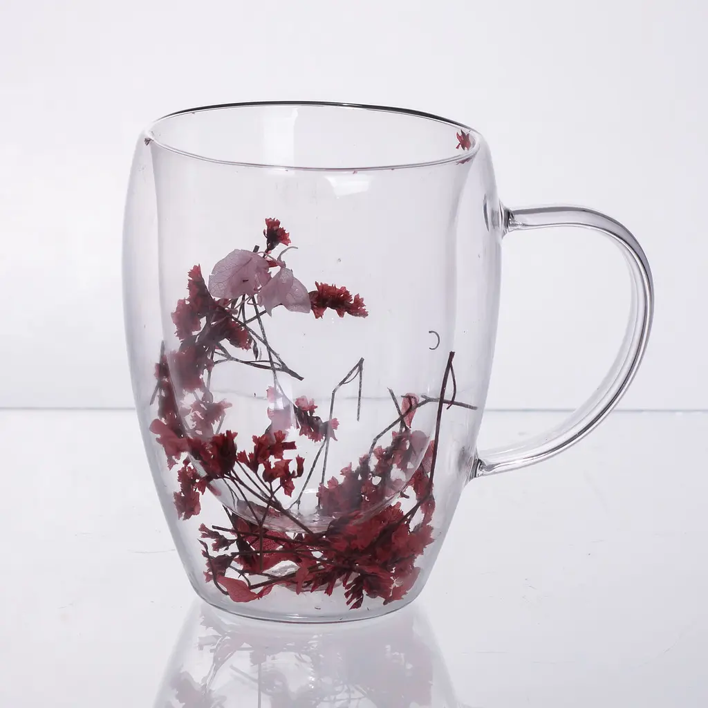 Добавьте нотку элегантности и романтики в ваш день с этой изящной чашкой с двойными стенками. Изящный дизайн с композицией из настоящих сухоцветов, запаянных между слоями стекла, превращает обычное чаепитие в особый ритуал. Чашка изготовлена из высококачественного боросиликатного стекла, которое выдерживает высокие температуры и дольше сохраняет горячий напиток. Благодаря конструкции с двойными стенками, ее удобно держать в руках, даже с кипятком внутри.
