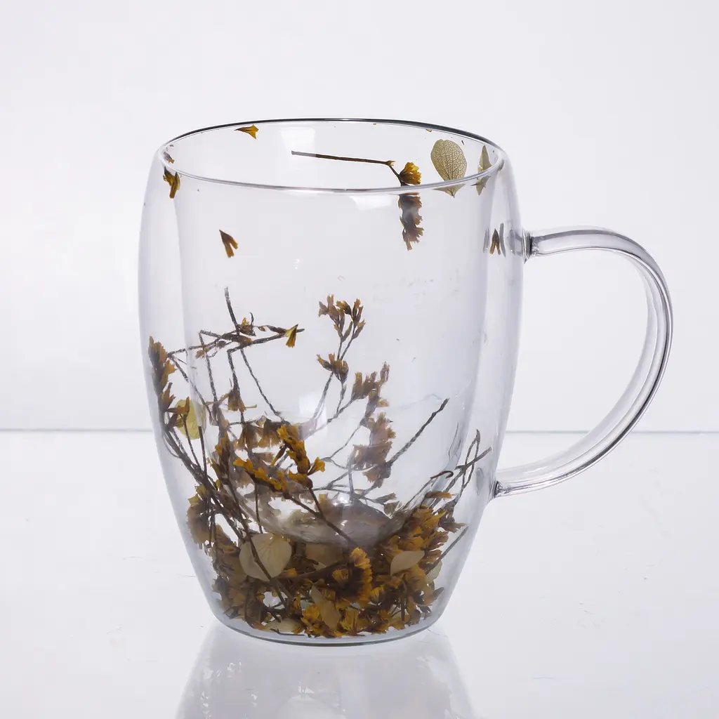 Добавьте нотку элегантности и романтики в ваш день с этой изящной чашкой с двойными стенками. Изящный дизайн с композицией из настоящих сухоцветов, запаянных между слоями стекла, превращает обычное чаепитие в особый ритуал. Чашка изготовлена из высококачественного боросиликатного стекла, которое выдерживает высокие температуры и дольше сохраняет горячий напиток. Благодаря конструкции с двойными стенками, ее удобно держать в руках, даже с кипятком внутри.