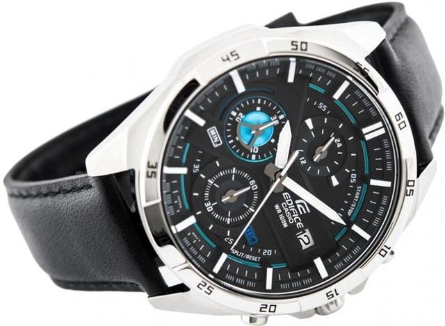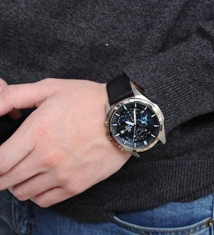 Сборка данной модели производится на сертифицированном заводе в Китае. Корпус изготовлен из высококачественной нержавеющей стали. На чёрном циферблате расположены часовые метки, дата, окошки хронографа и дополнительный показатель времени в 24-х часовом формате. Хронограф рассчитан на 30 минут. Люминесцентное покрытие на стрелках и метках обеспечивает длительное свечение в темноте. Стекло – минеральное, устойчивое к возникновению царапин. Чёрный ремешок изготовлен из натуральной кожи и имеет классическую застёжку – пряжку. Задняя крышка с винтовым фиксатором. Водонепроницаемость – 100 м, что позволит Вам плавать не снимая часов.