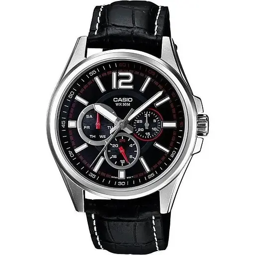 Мужские часы Casio MTP-1355L-1A, гарантия 24 месяца. Стальной корпус, кожаный браслет, отражение даты. Часы водонепроницаемые WR50.