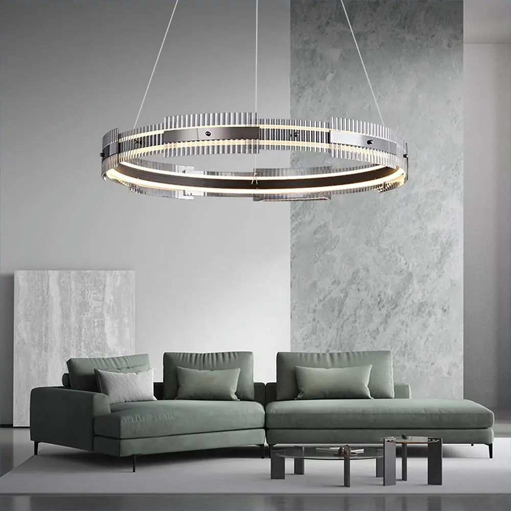 Дизайн этой люстры поражает своей изысканностью и стильностью. Подвесное кольцо изготовлено из металла черного цвета, а его внешняя сторона украшена графитовыми стеклянными рельефными пластинами двух размеров (выше и ниже), которые добавляют объемности и современной эстетики. Внутри кольца вверху и внизу расположены встроенные светодиоды с тремя режимами освещения: теплый, нейтральный и холодный свет. Модель доступна в двух размерах: Диаметр 60 см с мощностью 50 Вт. Диаметр 80 см с мощностью 67 Вт. Благодаря регулируемой высоте подвеса от 25 до 105 см, эта люстра гармонично впишется в помещение с разной высотой потолков. Эта модель станет идеальным выбором для просторных современных интерьеров, таких как гостиные, столовые или спальни. Ее современный дизайн и мягкий рассеянный свет создают уютную атмосферу, дополняя стильный декор. Тип цоколя: 10 Серия: MJ 231 Цвет основания: Черный Диаметр кольца: 80 см Размер потолочной основы: 15х4 см Цветовая температура: 3000–4500–6000К Максимальная высота: 105 см Минимальная высота: 25 см Материал основания: Металл Размер монтажной планки: 12,4 см Тип крепления: Крестовина Мощность (Вт): 67 w