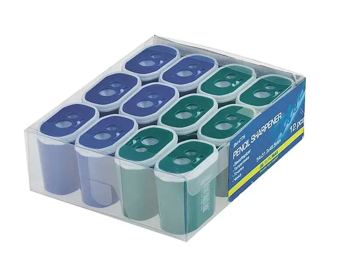 Чинка большая, 2 отверстия, пластиковый корпус, с контейнером, 12 шт. - Чинка большая (12 шт.) - точилка для карандашей для детей от 6 лет. Изготовлена из прочного пластика, с контейнером для стружки, 2 отверстия для разных размеров карандашей. Удобна для школы.