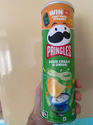 Класичні Pringles, які неможливо зупинитися їсти. Смак сметани та цибулі. Ціна була краща, ніж у супермаркетах.