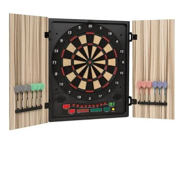 Составленный набор дротиков от Klarfit включает доску с электронным светодиодным дисплеем, а также двенадцать дротиков и блок питания. Стильный дартс можно установить всего в нескольких шагах, и вы можете начать метать дартс. Начинающие могут спокойно тренироваться с Dartmaster 180. Настоящие профессионалы соревнуются друг с другом или противостоят компьютерным соперникам, которым можно установить разные уровни сложности. Высококачественный светодиодный дисплей особенно практичен. Очки других игроков отображаются на нескольких дисплеях. Бумага, ручка и сложные арифметические упражнения в прошлом. Компьютер дартс заботится о вычислении и запоминании. Вы можете полностью сосредоточиться на великолепном броске. Нет ничего интереснее, чем бойкий вечер дартса с лучшими друзьями. Еще лучше, если вам не придется беспокоиться о любимой мебели. Мягкие дротики, входящие в комплект поставки, имеют мягкий, гибкий наконечник и потому не оставляют царапин. Даже если вы не попали в цель. Всего в набор входит четыре три стрелы разного дизайна.