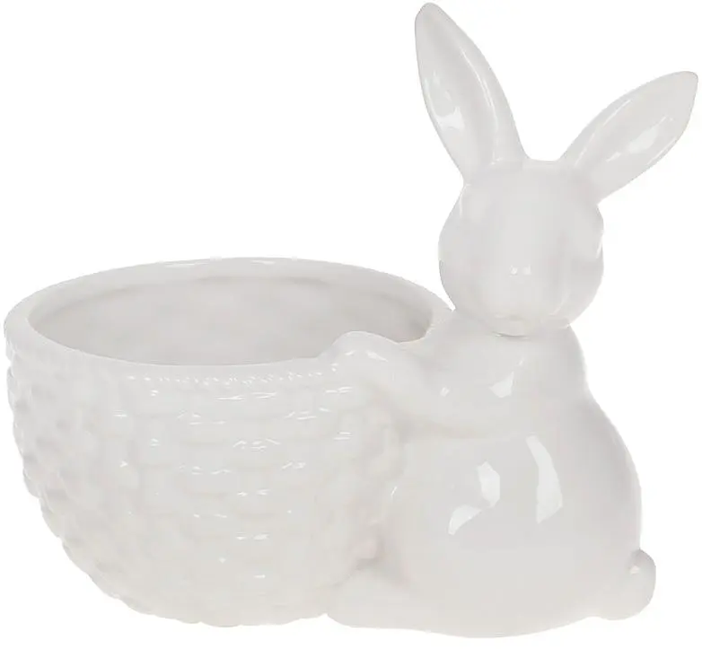 Декоративное кашпо "Кролик с корзинкой". Материал - керамика. Размер: 16х10.5х14см. Цвет - белый. Фигурка с мини-кашпо для выращивания маленьких комнатных растений или популярной микро-травы. Зелень можно подрезать, придавая самые разнообразные формы. Можно использовать как мини-вазочку или подсвечник. Безграничные возможности для Вашей фантазии.