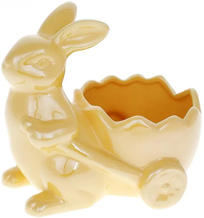 Декоративное кашпо "Кролик с тележкой". Материал - керамика. Размер: 16.5х13х15см. Цвет - жёлтый перламутр. Мини-кашпо для выращивания маленьких комнатных растений или популярной микро-травы. Зелень можно подрезать, придавая самые разнообразные формы. Можно использовать как мини-вазочку или подсвечник. Безграничные возможности для Вашей фантазии.