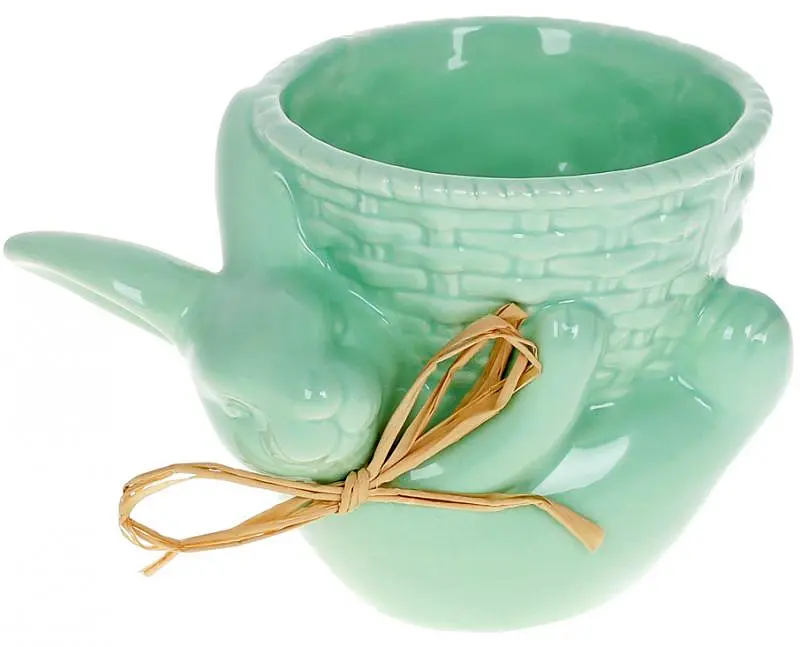 Декоративное кашпо "Зайка с корзинкой". Материал - керамика. Размер: 14х11х10см. Цвет - мятный. Мини-кашпо для выращивания маленьких комнатных растений или популярной микро-травы. Зелень можно подрезать, придавая самые разнообразные формы. Можно использовать как мини-вазочку или подсвечник. Безграничные возможности для Вашей фантазии.