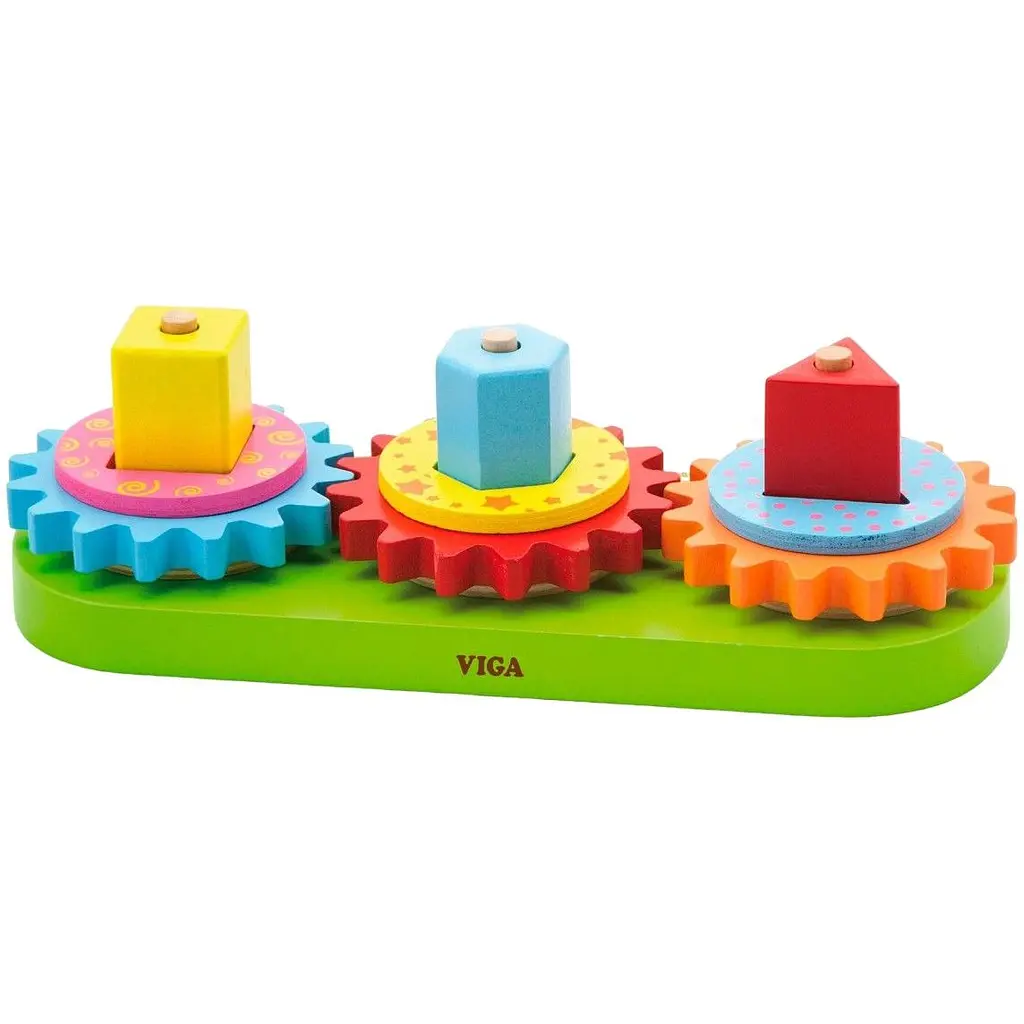 Деревянная пирамидка Viga Toys Шестеренки состоит из геометрических блоков, шестерен, шайб и колец. Малыш интересно проведет время, подбирая и нанизывая элементы на стержни основания, вращая блоки и шестерни и наблюдая за их взаимодействием. Игрушка знакомит с цветом и формами предметов, развивает логическое мышление и моторику рук.