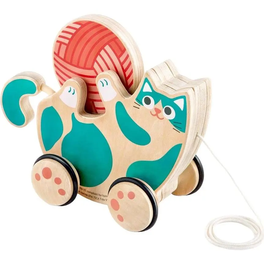 Деревянная каталка Hape Котенок с клубком нитей станет хорошим спутником для малышей от 12 месяцев на прогулках.