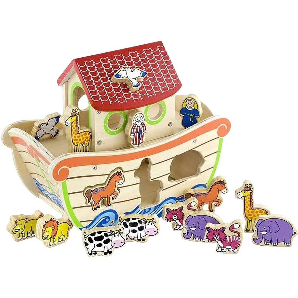 Ковчег со съемной крышей и отверстиями-сортерами, фигурки Ноя и его жены, 7 пар животных: львы, коровы, кошки, лошади, жирафы, голуби (или чайки)