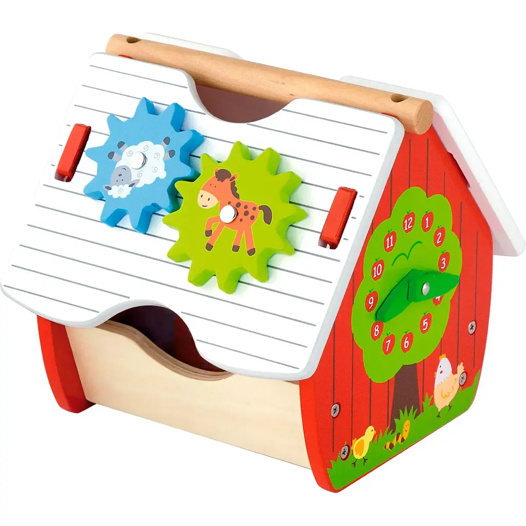 На одной из сторон домика расположены цветные шестерни, которые можно вращать. Это помогает детям развивать моторику рук и учить принцип работы механизмов.