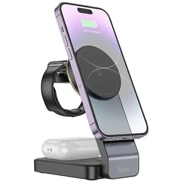 Держатель и зарядная беспроводная док-станция с подсветкой Hoco CQ3 folding 3-in-1 15W Беспроводное зарядное устройство Hoco CQ3 3-in-1 Magnetic 15W IP Version отличается оригинальным и изысканным дизайном. Благодаря компактным размерам и сложной конструкции устройство легко вписывается в любой интерьер и не занимает много места на рабочем столе или тумбочке. При необходимости его можно сложить для удобной транспортировки или хранения. Корпус изготовлен из прочной комбинации поликарбоната, ABS пластика и алюминиевого сплава, что обеспечивает длительный срок эксплуатации устройства. Универсальная функциональность Устройство предназначено для одновременной беспроводной зарядки трех совместимых гаджетов: смартфона, беспроводных наушников и смарт-часов. Это делает его идеальным решением для пользователей, стремящихся минимизировать количество проводов и зарядных устройств в своем пространстве. Поддержка технологии Qi гарантирует широкую совместимость с разными устройствами. Высокая мощность и эффективность С максимальной мощностью на выходе 15W, Hoco CQ3 обеспечивает быструю и эффективную зарядку ваших устройств. Сила тока на разъемах достигает 3A при 5V и 9V, что способствует ускоренной зарядке без риска перегрева. Наличие противоскользящих накладок и перфорации на нижней панели способствует эффективному отводу тепла. Технологическое совершенство Основная складная панель устройства предназначена для подзарядки смартфона и может использоваться в качестве подставки для устройств с поддержкой MagSafe. Специальная складная "полочка" на задней панели предназначена для зарядки Apple Watch 1-8 поколений и их версий SE/SE2, а верхняя панель основания с углублением предназначена для зарядки кейса беспроводных наушников. Это делает Hoco CQ3 максимально удобным и функциональным решением. Стильная LED-подсветка Модель дополнена стильной LED-подсветкой и кнопкой для ее включения, что не только придает устройству современный вид, но и делает его использование удобным в условиях недостаточного освещения. Это позволяет легко находить устройство во тьме и придает ему эстетическую привлекательность. Простота подключения и использования Благодаря наличию разъема Type-C и комплектному кабелю длиной 0.5 м, подключение устройства к источнику питания производится быстро и без хлопот. Поддержка быстрой зарядки Fast Charging гарантирует, что ваши устройства будут заряжаться с максимальной скоростью и эффективностью. Преимущества: Возможность одновременной зарядки трех устройств. Компактная и складная конструкция, удобная для транспортировки и хранения. Высокая мощность и быстрая зарядка с поддержкой различных выходных параметров. Стильная LED-подсветка с кнопкой включения для удобства использования в темноте. Прочный и надежный корпус из комбинации поликарбоната, ABS пластика и алюминиевого сплава. Комплект: Магнитное бедровидное быстрое ЗУ magnetic wireless fast charger Кабель Type-C Инструкция Фирменная упаковка Характеристики: USB-порты: 1 Быстрая зарядка: Fast Charging Тип: Док-станция/беспроводная Выходной разъем: Type-C Длина 0:00 Длина индикатор Интерфейс подключения: Magsafe Комплектация: ЗЗП Hoco CQ3 3-in-1, кабель Type-C, инструкция Конструкция: Складные Материал корпуса: Поликарбонат Мощность: 15 Вт Сила тока на разъемах: 3A за 5V, 3 A за 9V Сила то: 137 x 68 x 32 мм Вес: 222 г Материалы: ABS+PC+Алюминиевый сплав Выходная мощност