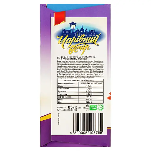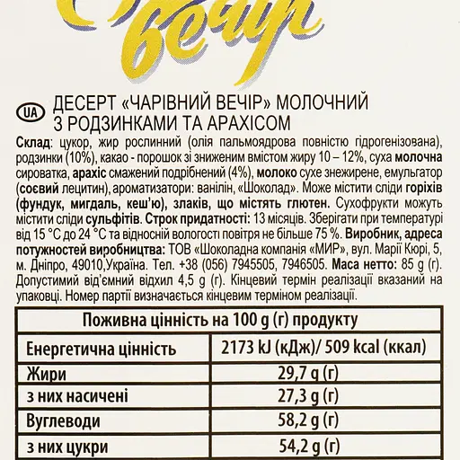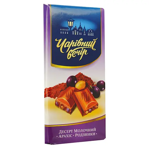 Десерт молочний від виробника «Чарівний вечір» з горіхами та родзинками, це смачний десерт за смішну ціну. Солодка плиточка це не е класичний шоколад, але дуже смачний солодкий десерт у якому дійсно е горішки та родзинки в достатньої кількості. Десерт завжди приходе свіжим, дуже приемний на смак для прихильників солоденького. Чудово пасує до кави або чаю. Я за смаком не кладу цукор в напої, коли пью каву або чай з цим десертом. Ціна цього десерту набагато нижча його якості. Дуже якісний продукт. Коли купувала у перше, не сподівалась на таку високу якість. Обов‘язково буду купувати ще.