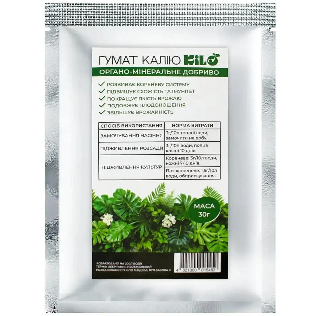 Комплексное микроудобрение на основе гуматов калия для улучшения плодородия и стимуляции роста растений. Способствует улучшению корнеобразования, повышению устойчивости к стрессам, усилению питания и общему развитию культур. Удобная фасовка 30 г – для приготовления рабочего раствора под корневой полив или опрыскивание.