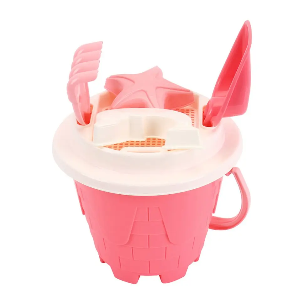Розовая ведерко-замковая башня: Милое и крепкое ведерко, выполненное в форме сказочной замковой башни в нежных розовых оттенках. Идеально подходит для наполнения песком и водой, поощряя малышей к первым строительным экспериментам.