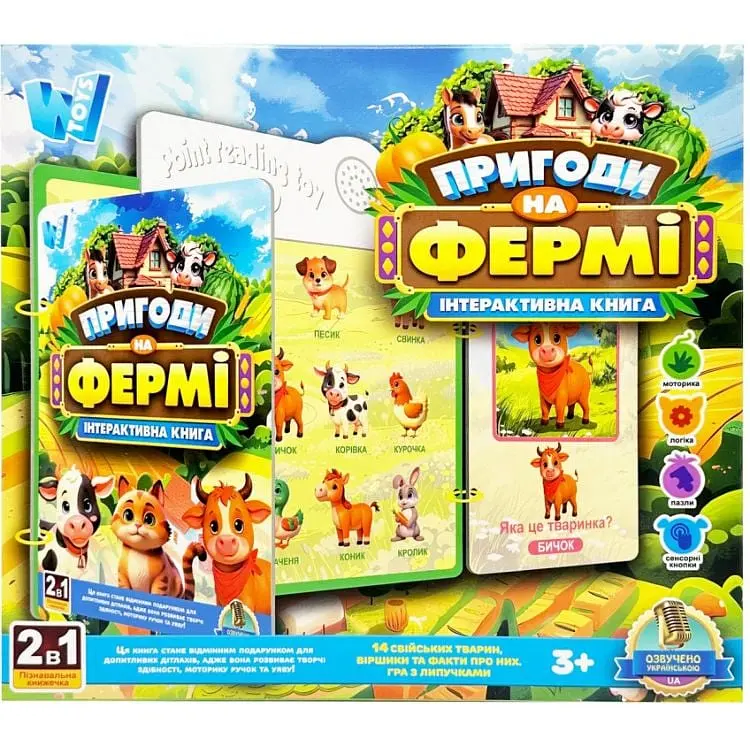 Восемь двусторонних страниц содержат яркие иллюстрации и познавательные задания. Сенсорные кнопки, воспроизводящие звуки, помогают малышу познакомиться с миром фермы еще ближе.
