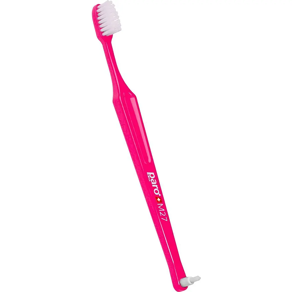 Детская зубная щетка Paro Swiss M27 с монопучковой насадкой имеет тонкую шейку и уникальную длинную ручку, что гарантирует правильное позиционирование и использование.